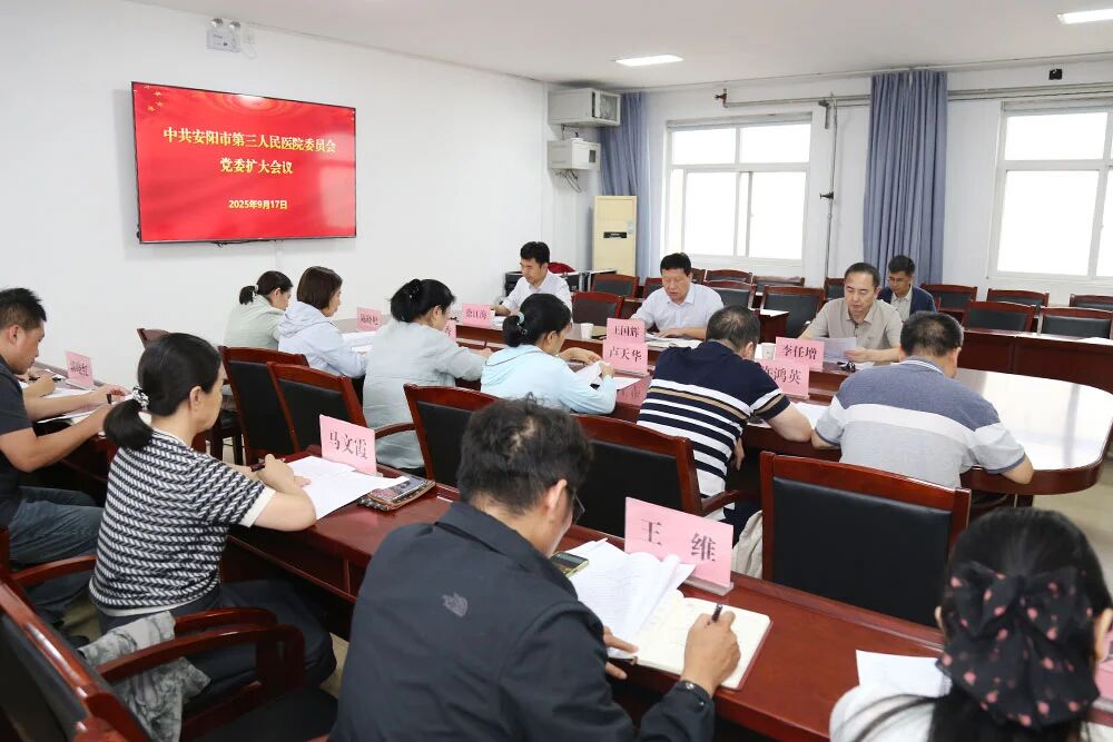 2025年9月17日,安阳市第三人民医院召开党委扩大会,总结深入贯彻中央八项规定精神学习教育工作,院领导班子、各党支部书记参加会议。