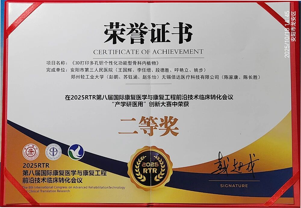 2025年10月17日下午,在山东省日照市举行的2025RTR第八届国际康复与康复工程前沿技术临床转化会议——“产学研医用”创新大奖赛决赛中,安阳市第三人民医院李任增博士保膝团队凭借出色的临床科研创新成果与精彩的现场表现,经过激烈角逐,在国内顶尖高校与医院组成的 17 支决赛队伍(含上海交大、康复大学)中脱颖而出,荣获大赛二等奖。这一荣誉是医院长期坚持临床与科研并重、积极推动创新成果转化的有力证明。