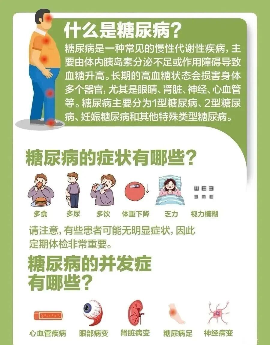 糖尿病是一种慢性、全身性、代谢性、进展性疾病,以血糖升高为特征。长期高血糖可引起多种器官损害,导致残废或过早死亡。因此,糖尿病的危害不仅在于疾病本身,更在于其引发的并发症,如糖尿病周围神经病变、视网膜病变、肾病、糖尿病足等。