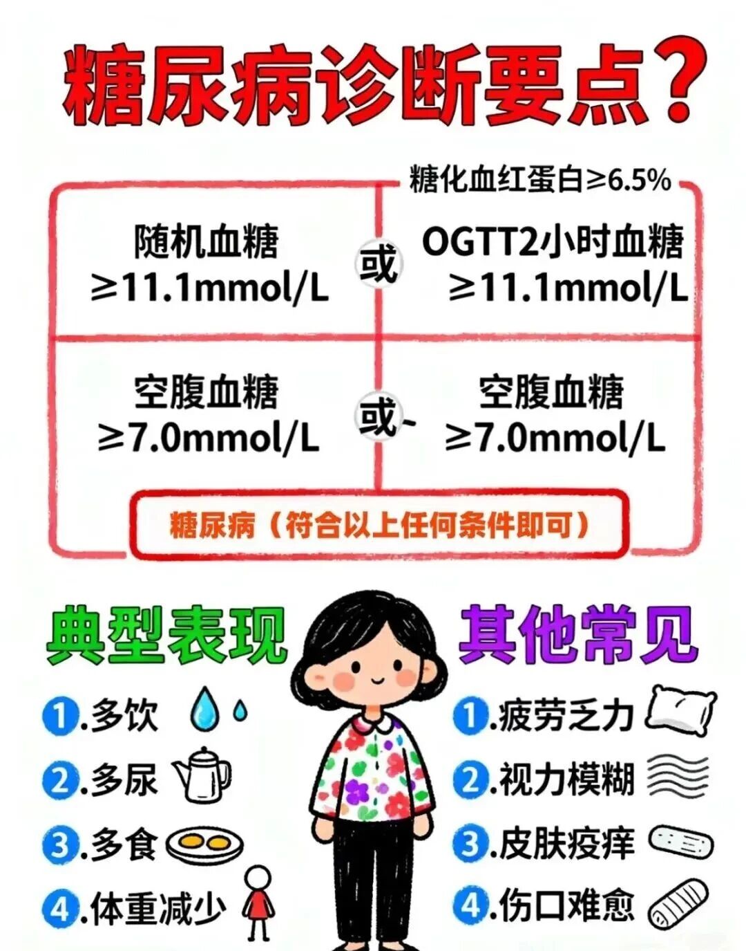 有糖尿病“三多一少”等(多饮、多食、多尿、体重下降、皮肤瘙痒、视力模糊等急性代谢紊乱表现)症状者,同时一天中任一时间血糖≥11.1mmol/L(200mg/dl);空腹血糖水平≥7.0mmol/L(126mg/dl);口服葡萄糖耐量试验 2 小时血糖水平≥11.1mmol/L(200mg/dl)。无糖尿病症状者,须改日重复检查以确诊。