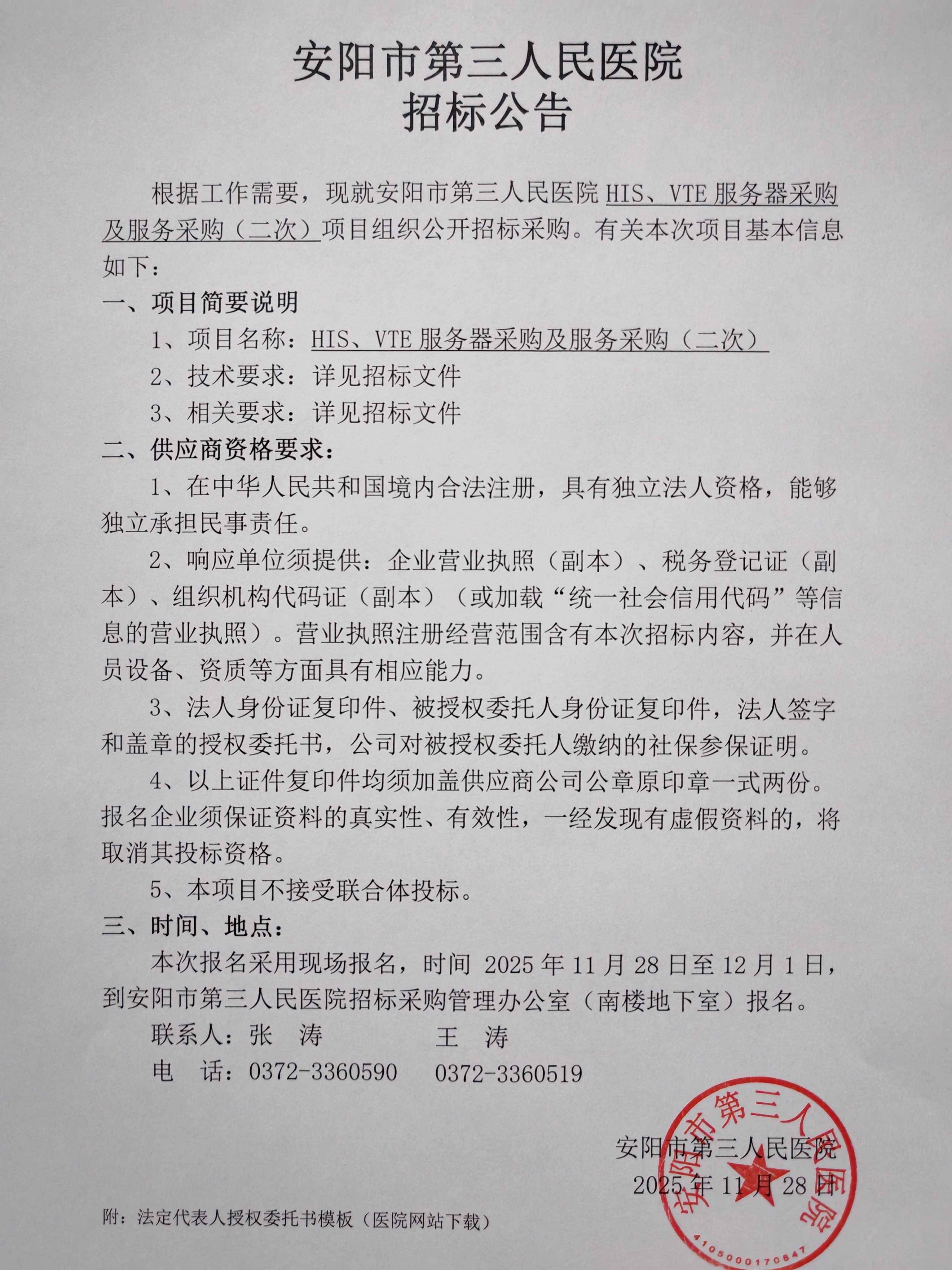 招标公告【HIS、VTE服务器采购及服务采购(二次)】