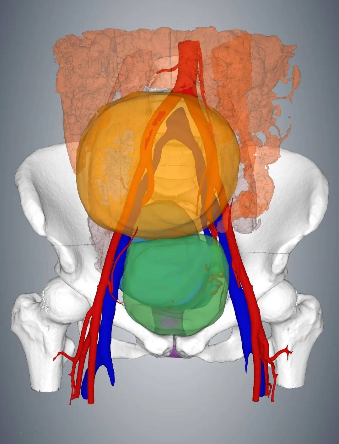 张会美主治医生说,“好比在布满障碍物的复杂地形里作业,以前多少得靠点经验和直觉。”现在情况不同了。术前,团队通过三维重建技术,把患者的影像数据变成了一个精准的盆腔立体模型。“就像拿到了一个实景导航,”主刀医生王爱香主任形容,“肿瘤长在哪儿、血管怎么走、粘连有多紧,全都一目了然。”
