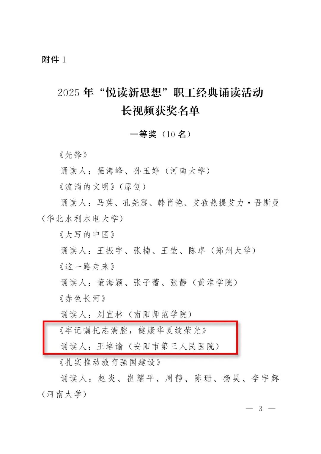 捷报丨安阳市第三人民医院王培谕在2025年河南省“悦读新思想”职工经典诵读活动中斩获一等奖