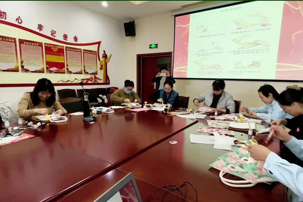 与此同时,22楼党员活动室内,手提袋DIY活动也拉开了序幕,女职工们化身“设计师”,在素色布袋上粘贴出独具个性的图案。