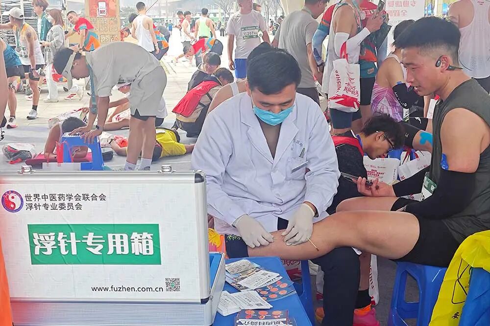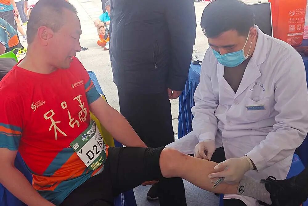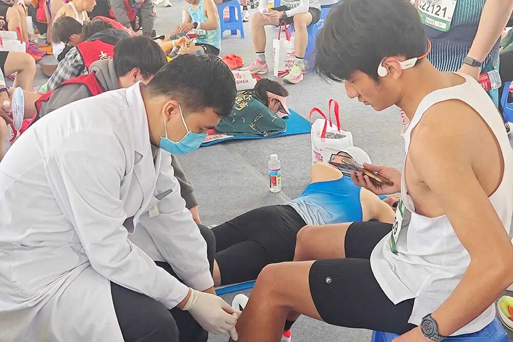 随着选手们陆续冲过终点,肌肉酸痛与关节僵硬等延迟性反应成为完赛跑者的“必修课”。此时,肌肉科团队并未停歇,而是立即投入到紧张的赛后恢复治疗中。