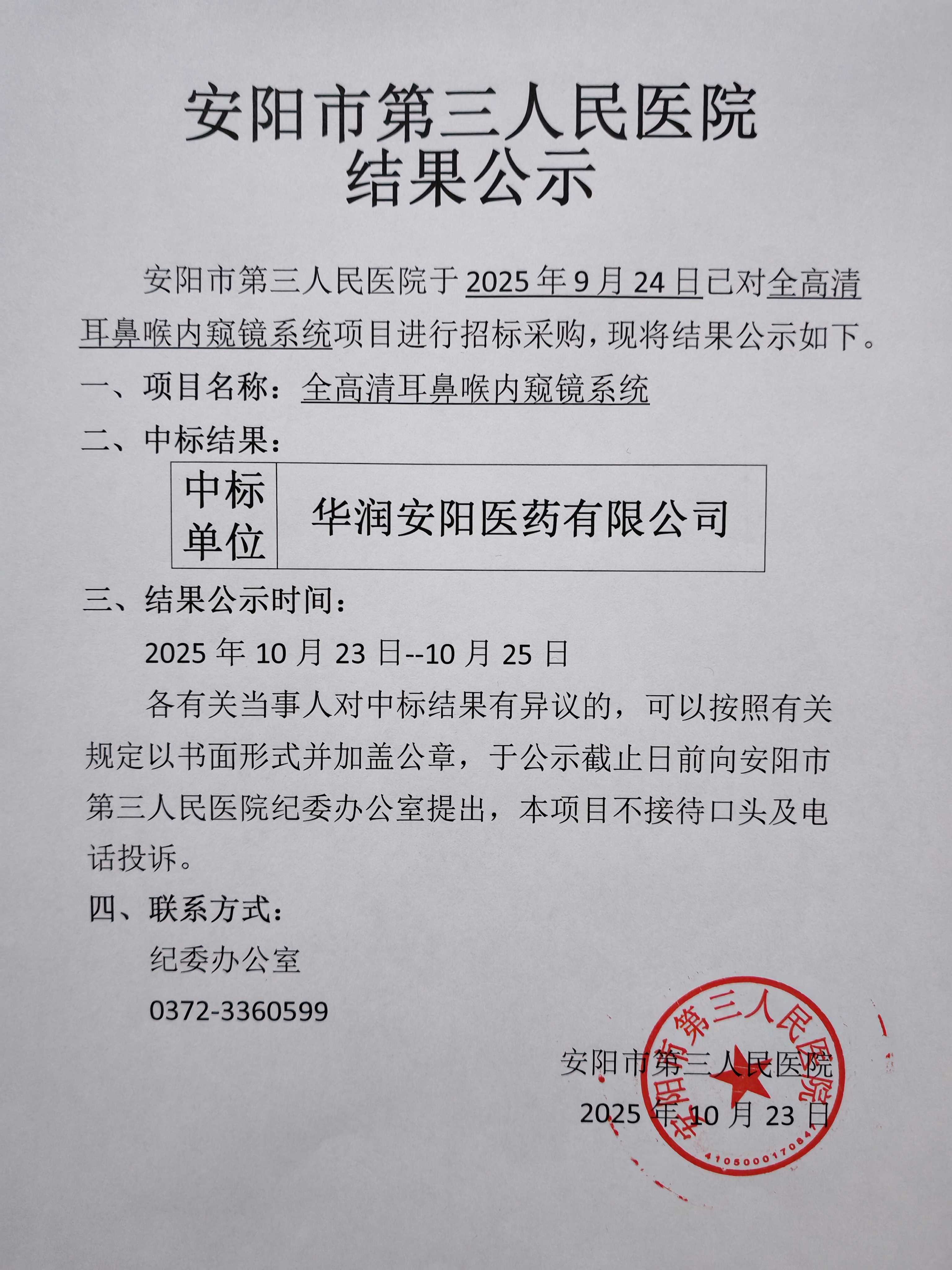 结果公示(全高清耳鼻喉内窥镜系统)