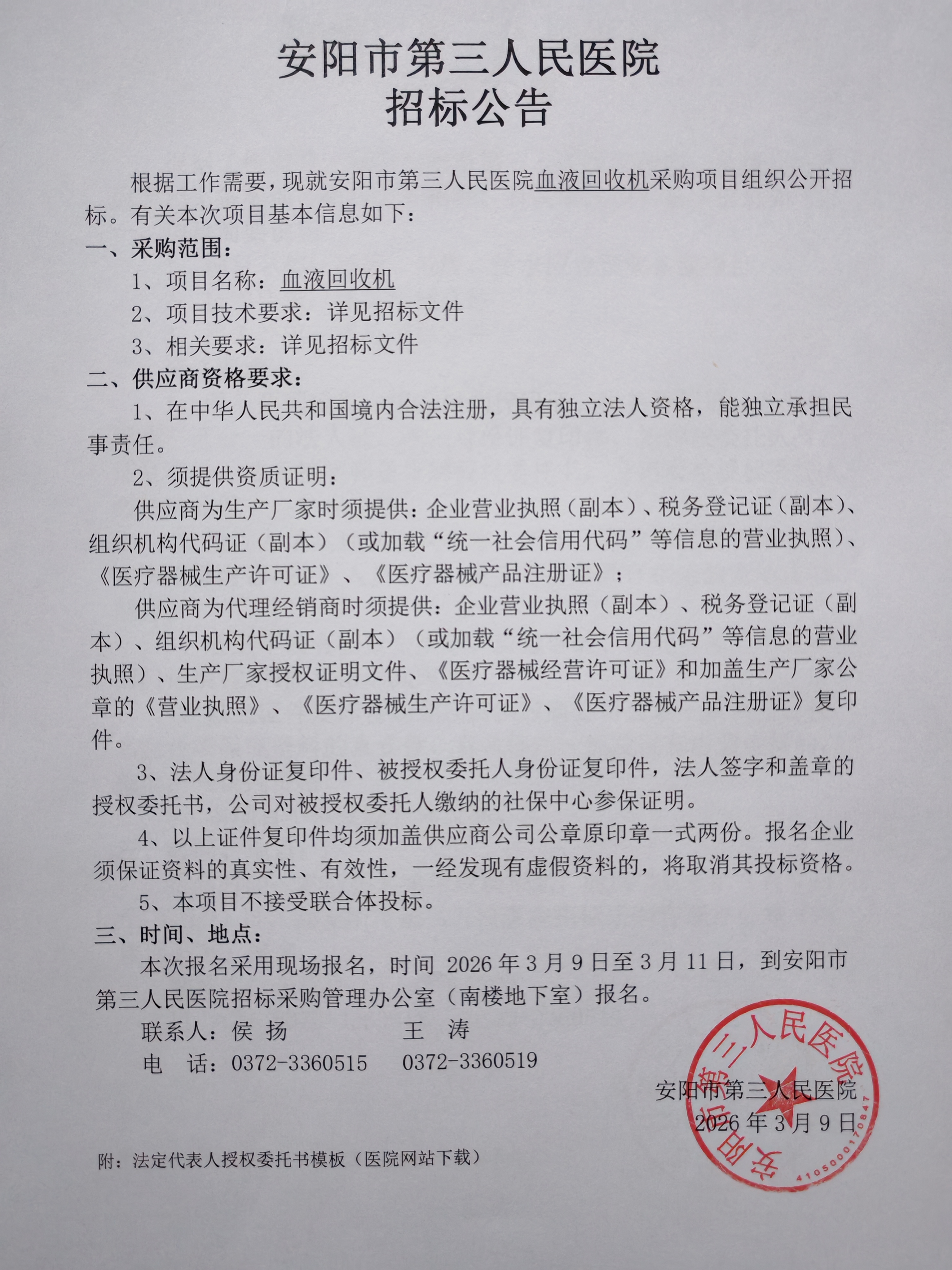 招标公告(血液回收机)