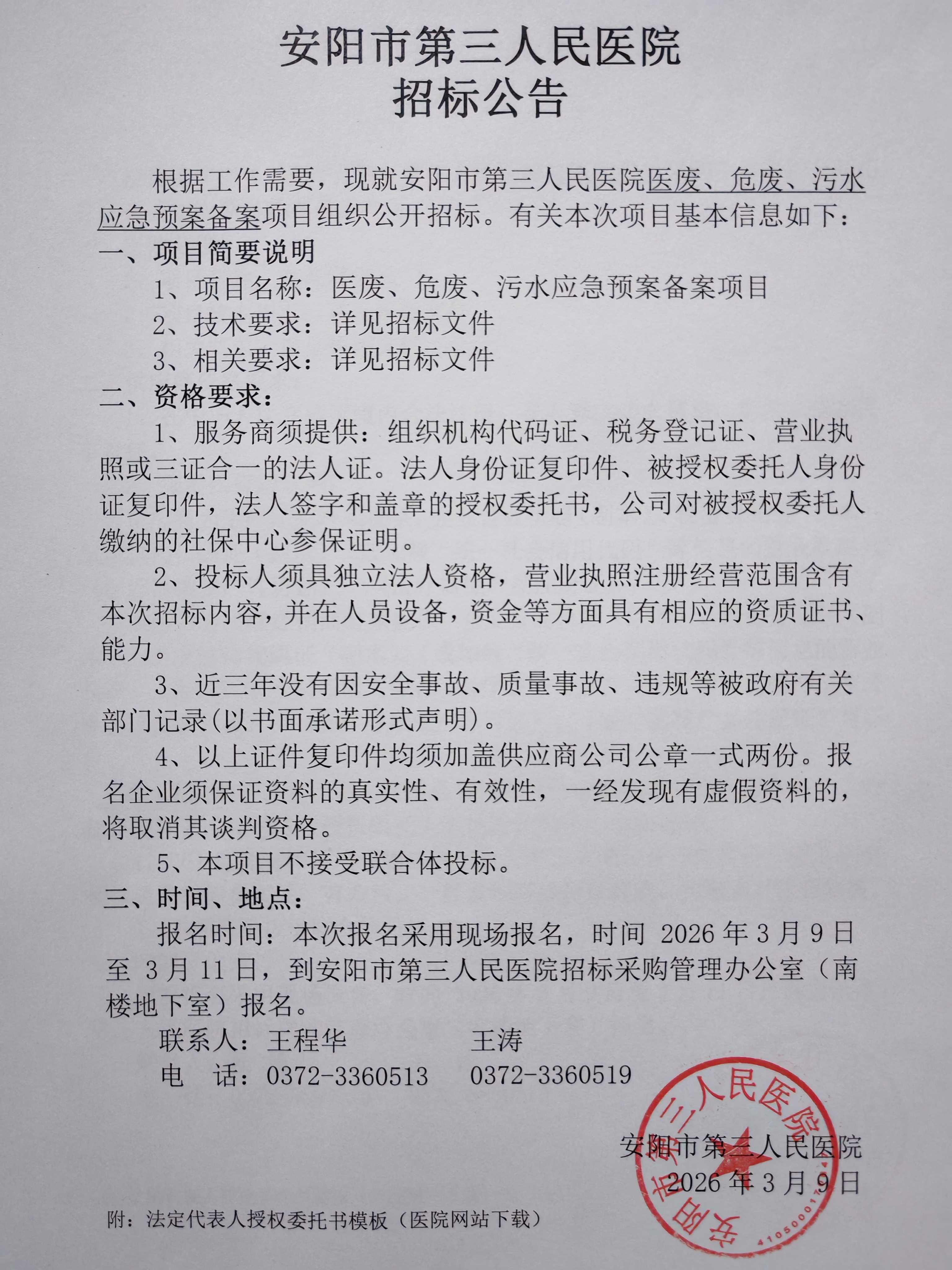 招标公告(医废、危废、污水应急预案备案项目)