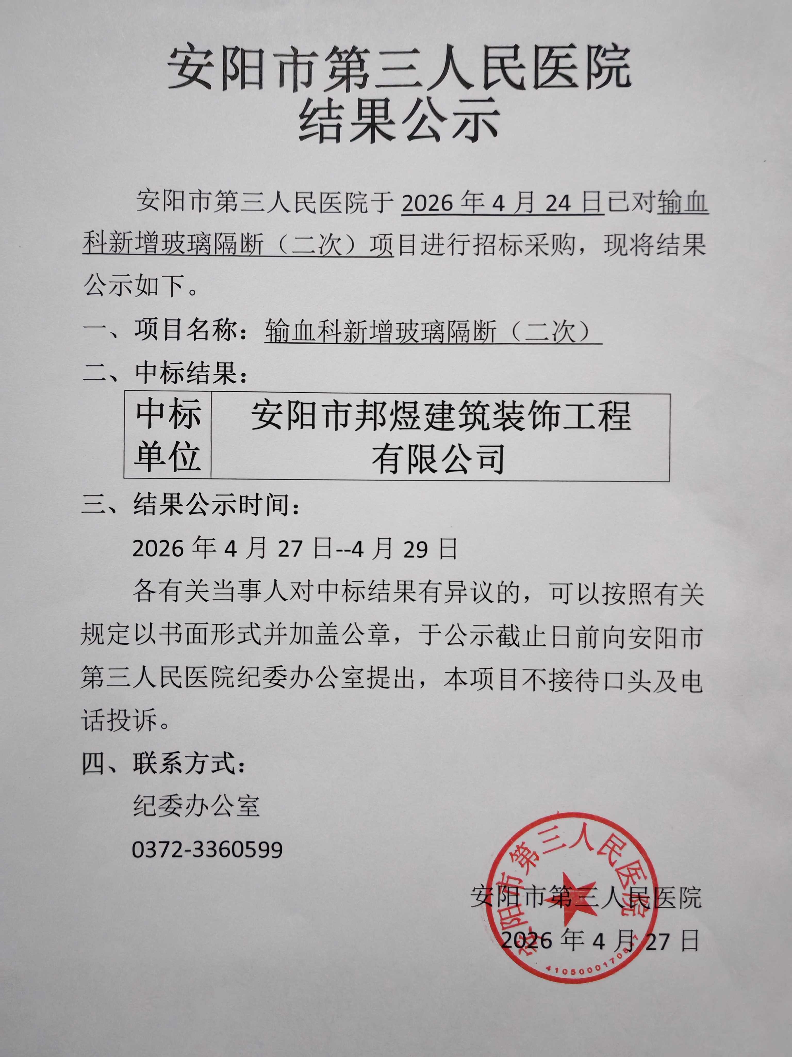 结果公示【输血科新增玻璃隔断(二次)】